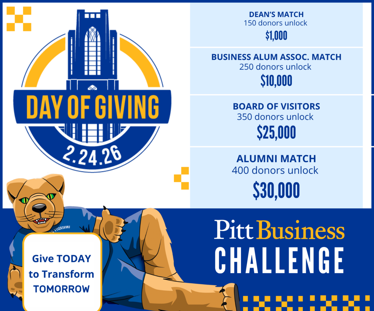 Pitt Business Challenges give alumni, parents, students, faculty, staff and friends the chance to watch your gift grow—and this year we're raising our sights again! Your gift –big or small—will unlock exciting Challenge Funds that will have a direct and immediate impact on the Business School. Every single gift moves us closer to our goal and it only takes a moment to make a difference! Let’s do this together and show just how much Pitt Business pride can accomplish in a single day.
